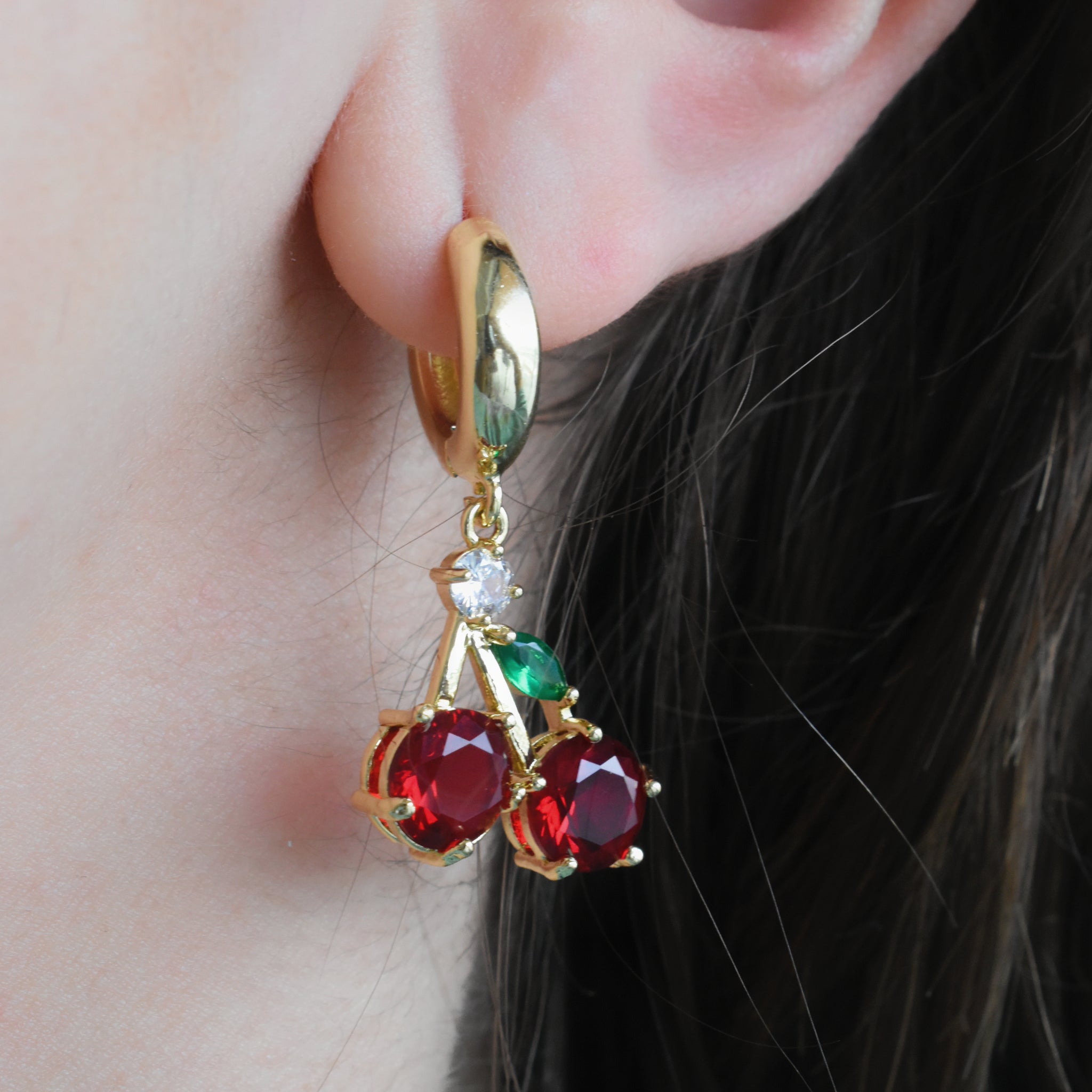 Aretes huggies cerezas circonias rojas